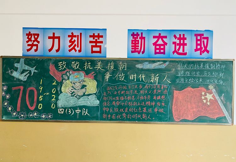 十三周的黑板报主题为“致敬抗美援朝 争做时代新人”。全班动员查找、筛选材料,精心设计这一期黑板报,掀起了学习热潮,营造出弘扬伟大抗美援朝精神的良好氛围。