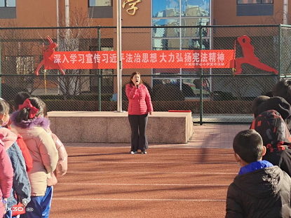 2020年11月30日在升旗仪式上,启动“深入学习宣传习近平法治思想,大力弘扬宪法精神”宣传周活动,仪式上德育主任陈洪慧讲解宪法知识和民法典内容,培育我校学生的宪法意识、国家意识、规则意识。